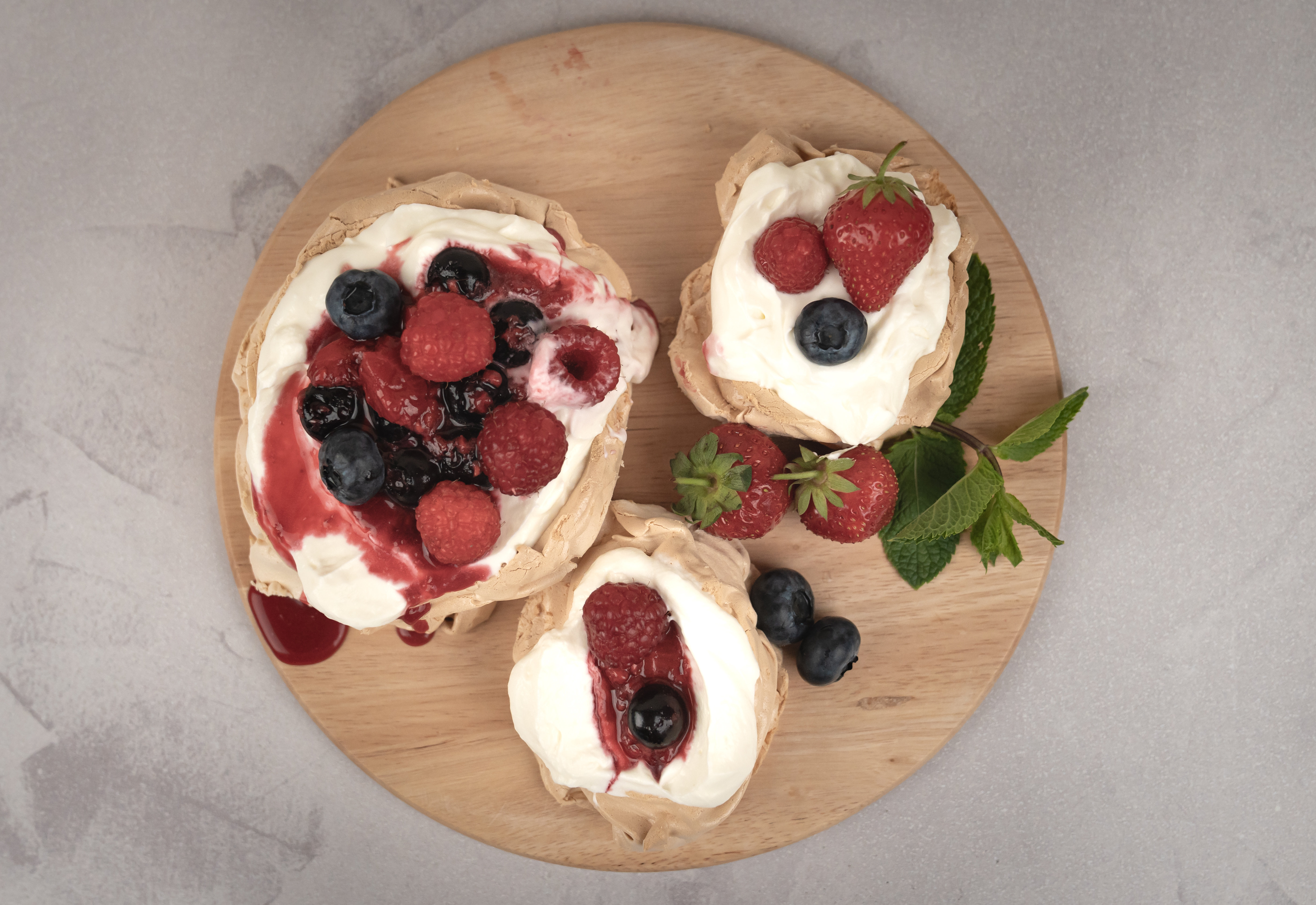 Rahm steif schlagen und griechisches Joghurt und Holunderblütensirup daruntermischen. Beeren in Stückchen schneiden und nach der Creme auf den Pavlovas verteilen.